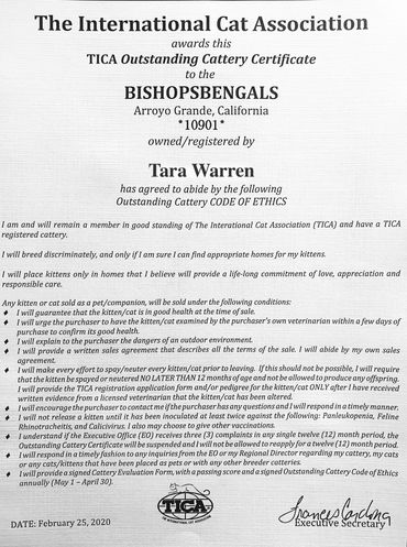 Bishops Bengals has been recognized and presented with an Outstanding Cattery certificate from The International Cat Association. Permitted, Licensed, and Excellent Inspections for over 20 years.